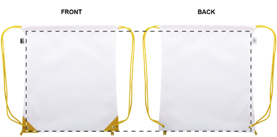 Custom made tas met trekkoord van 600D RPET polyester, met versterkte PU-lederen hoeken en dikke touwtjes in bijpassende kleur. Met all-over sublimatiedruk en onderscheidend RPET-label. MOQ: 25 stuks.