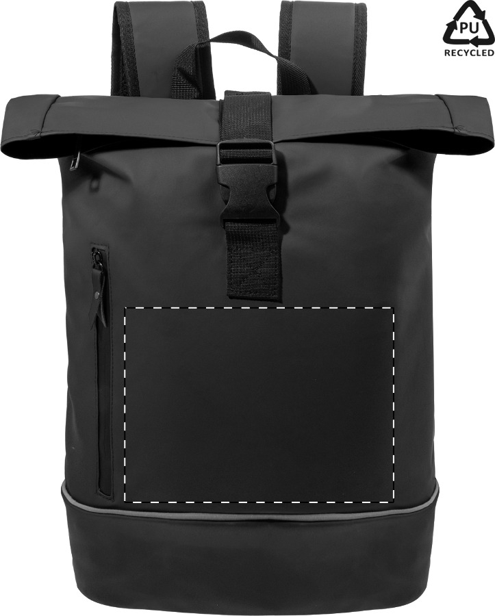 Waterdichte, zachte gerecyclede PU lederen rolltop rugzak met rits hoofdvak met gespsluiting, voorvak met waterdichte ritssluiting, gewatteerd laptopvak (15") en reflecterende strip. Met gevoerde rug - en schouderbanden. Met onderscheidend gerecycled PU-label.