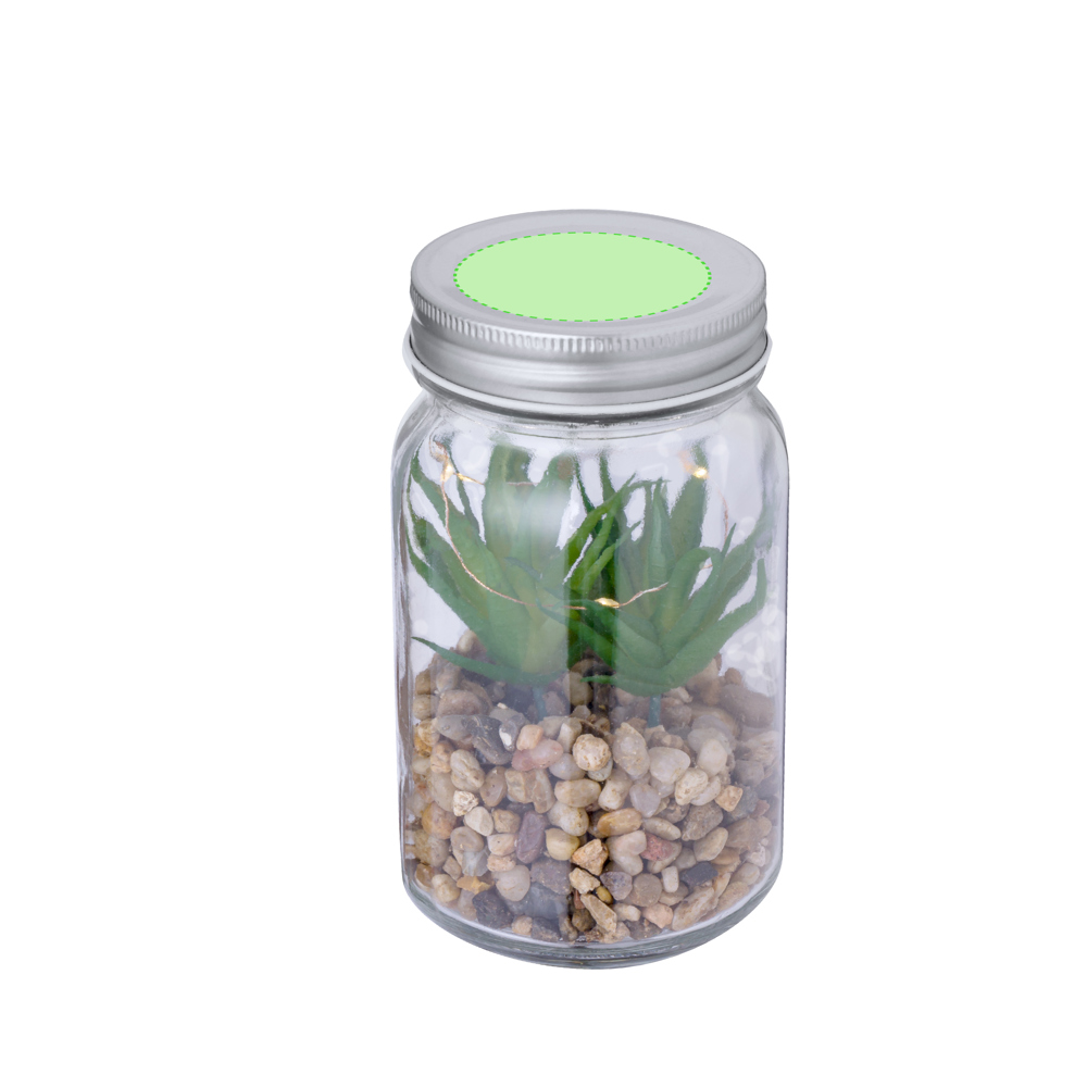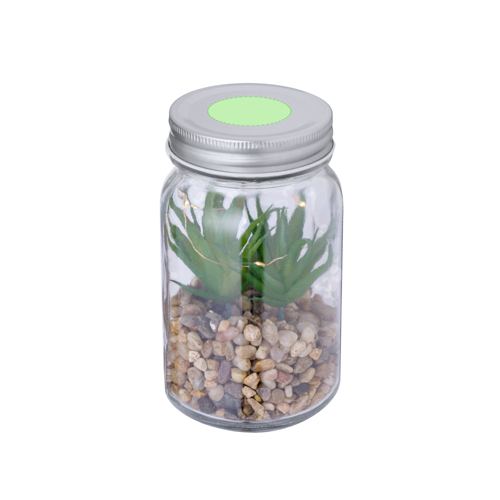 "Decoratieve plant op een voet van stenen, in een pot van borosilicaatglas. Verlicht door 5 LED's en gevoed door 3 AAA-batterijen (niet inbegrepen). Gepresenteerd in een kraft-designdoos.Gemaakt van borosilicaatglas, dat uitzonderlijke sterkte en duurzaamheid biedt, de levensduur verlengt en talloze keren kan worden hergebruikt."