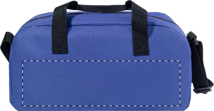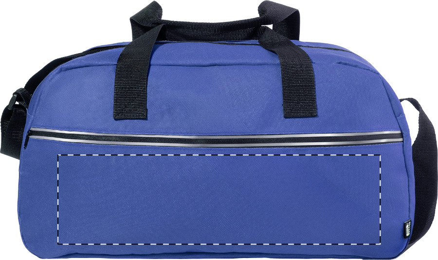 RPET-sporttas met hoofdvak met ritssluiting, voorvak met ritssluiting en reflecterende strips en verstelbare schouderband. 600D RPET polyester, met onderscheidend RPET label.