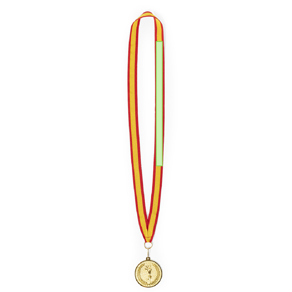 Metalen medaille met polyester lint in rode afwerking met Spaanse vlag. Met karabijnhaaksluiting voor het eenvoudig printen en verkrijgbaar in de modellen goud, zilver en brons.
