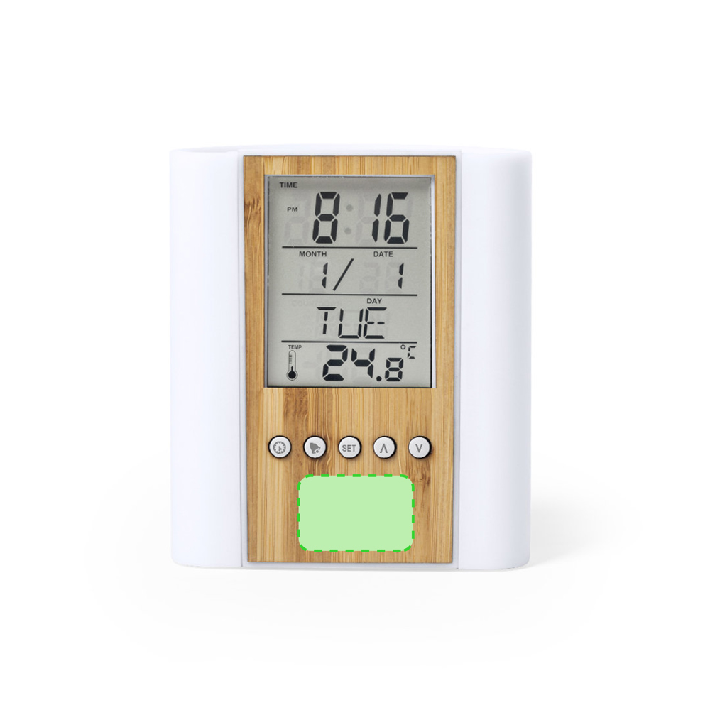 Natuurlijn pennenhouder met geïntegreerde multifunctionele klok. Gemaakt van een combinatie van bamboe en ABS materialen. Thermometer, kalender en alarmfuncties, timer en verjaardagsherinnering. Werkt op batterijen (celbatterij inbegrepen) en wordt gepresenteerd in een aantrekkelijke eco-ontwerpdoos. Gebruiksaanwijzing beschikbaar in het Spaans en Engels.